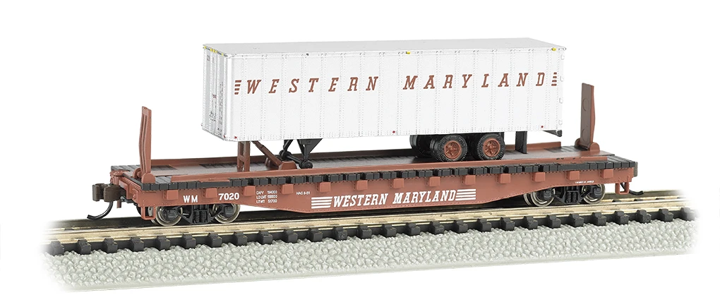 The 52′ 6″ Flat Car has ramps that you can lift up and down and body-mounted E-Z Mate® Mark II couplers. The removable 35′ Piggyback Trailer features graphics to match the prototype. Optional set of Rapido couplers included.
