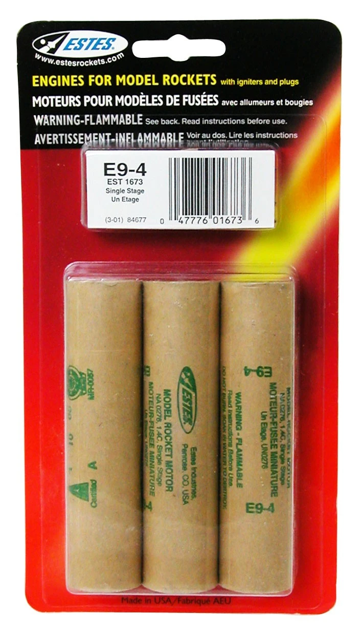 The Estes E9-4 engine is a single stage engine designed for model rocket flight. This engine is designed for flights in rockets weighing less than 15 ounces, including the engine. Each package includes 3 engines, 4 starters and 4 starter plugs.