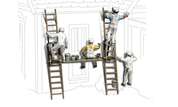 A set of men in white painter’s overalls. White scaffolding, drums of paint and smaller cans of paint are included.